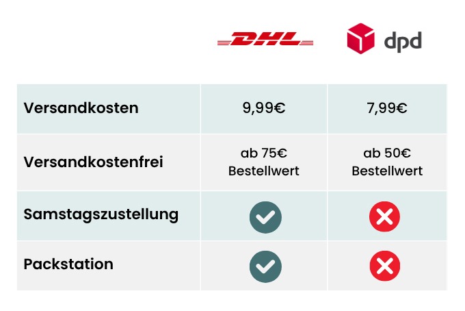Wie du sicher schon weißt, sind Bestellungen ab 50 € Bestellwert versandkostenfrei.